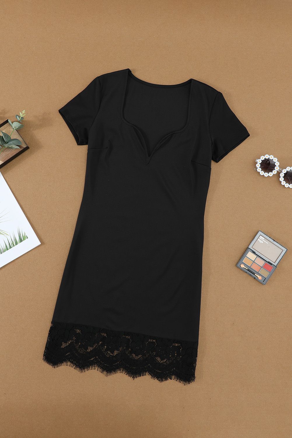 Black Short Sleeve Lace Trim Bodycon Mini Dress