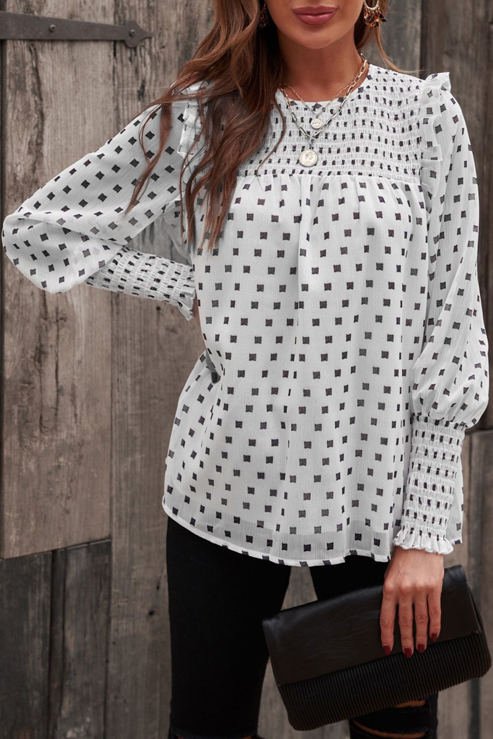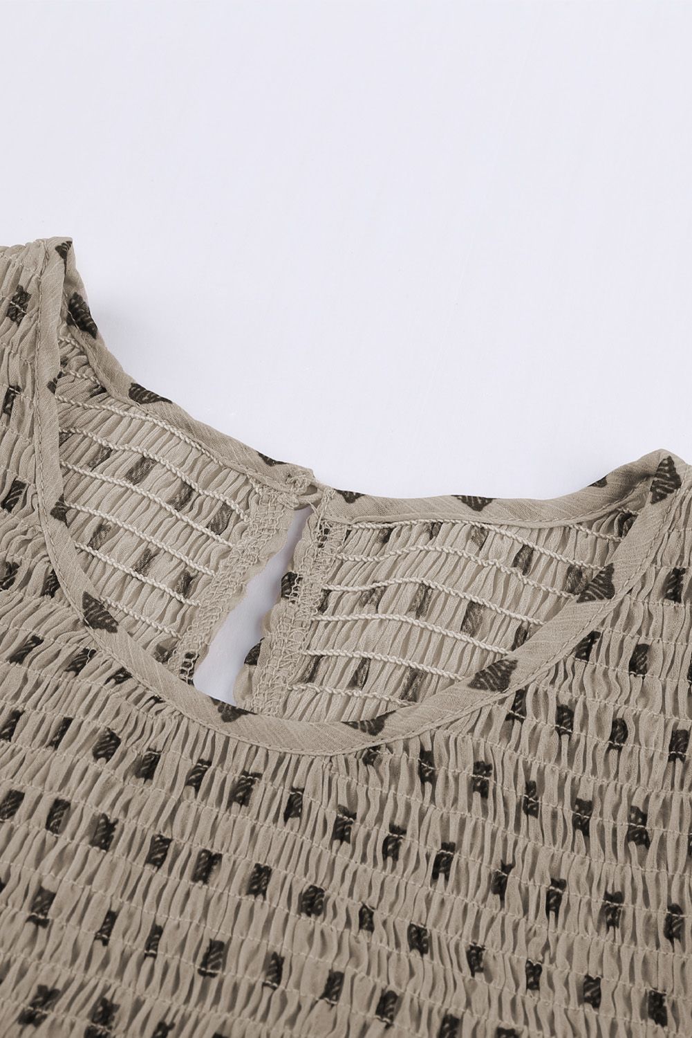A light crepey fabrication is elevated with square pattern on this relaxed fit blouse
