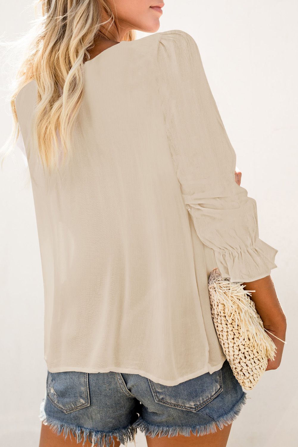 Split neck with buttons on the front, romantic bubble sleeve with ruffled cuffs