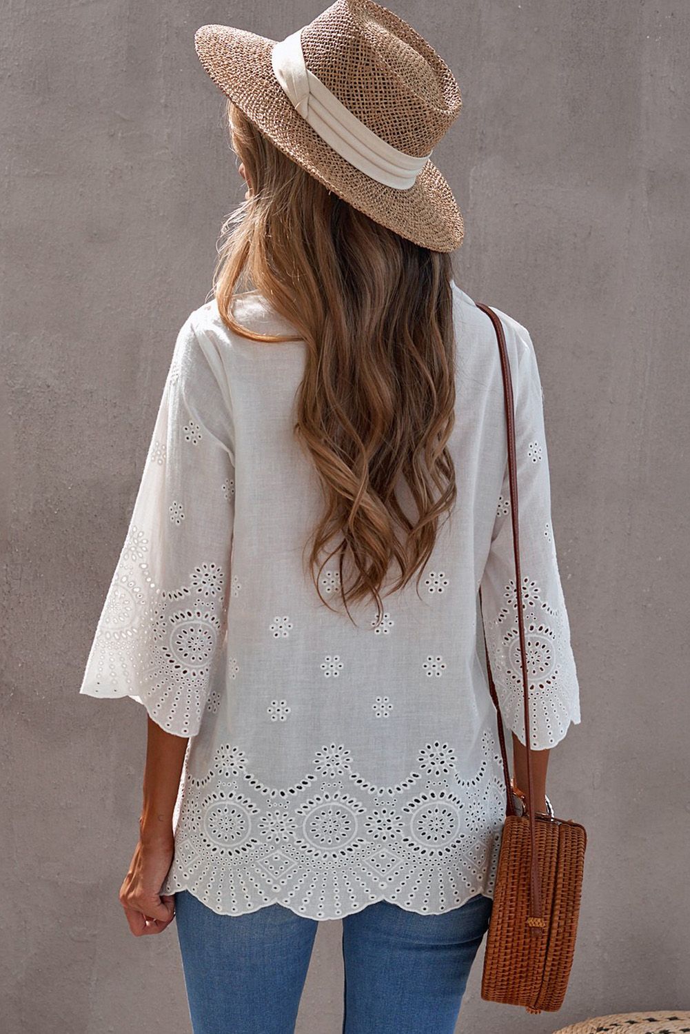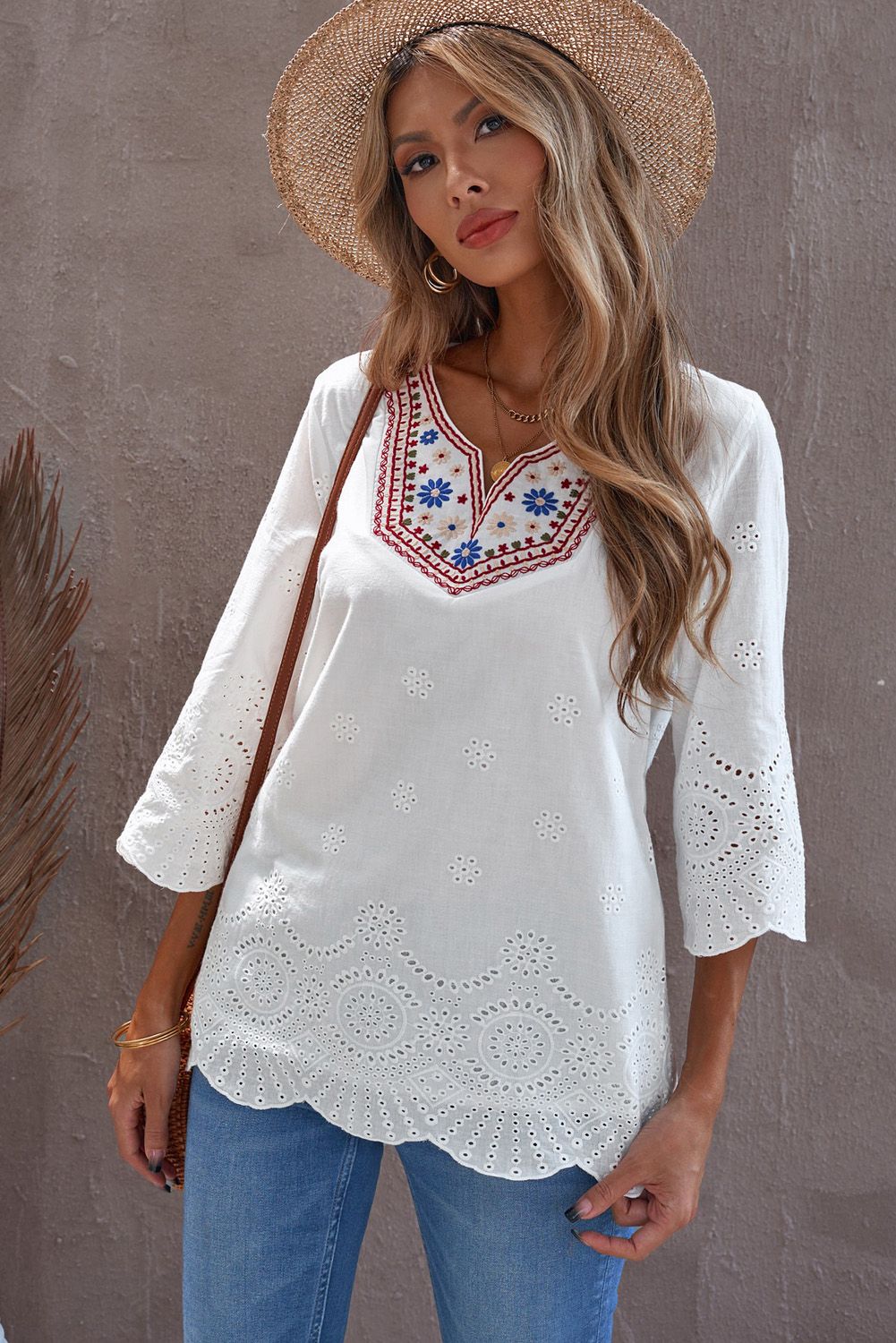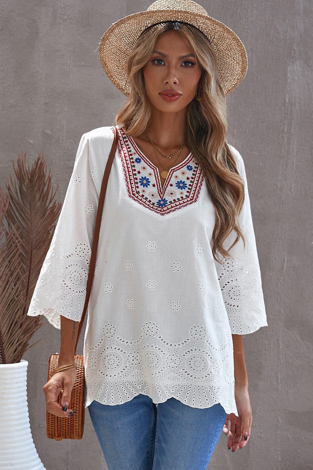 Embroidered Floral Hollow-out Bell Sleeve Blouse