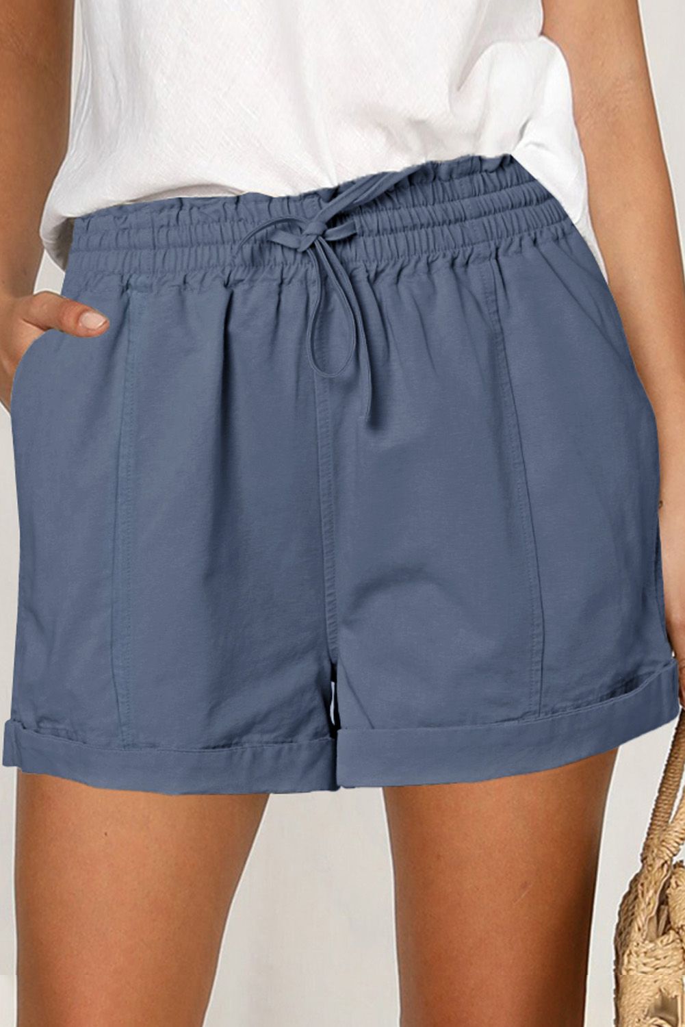 Black Elastic Waist Drawstring Roll Hem Shorts