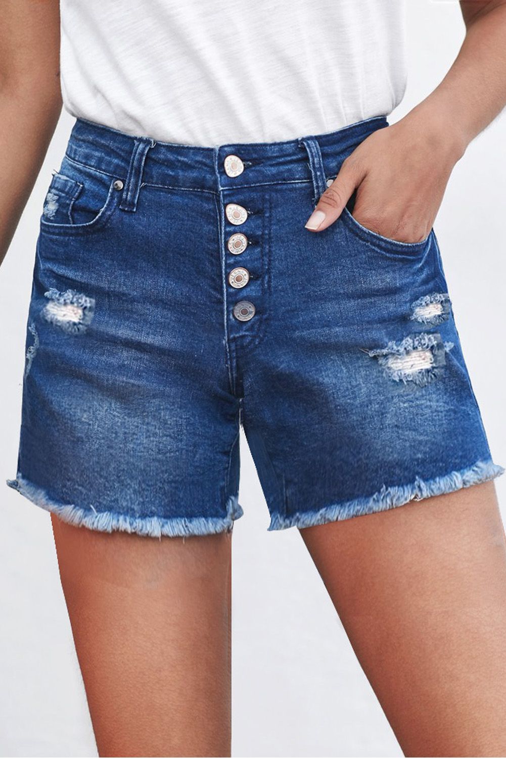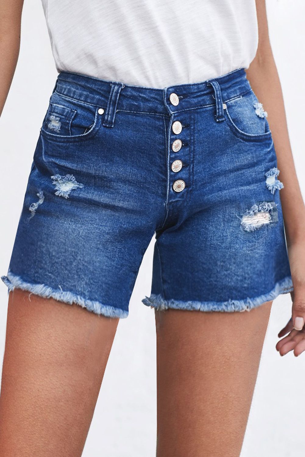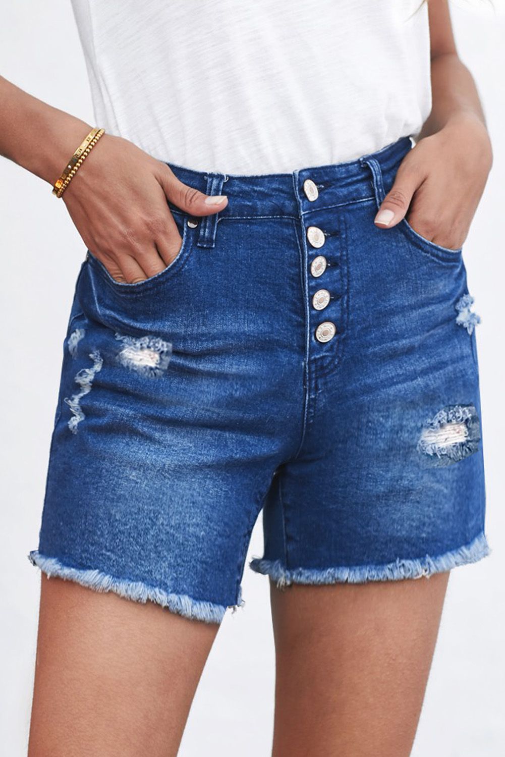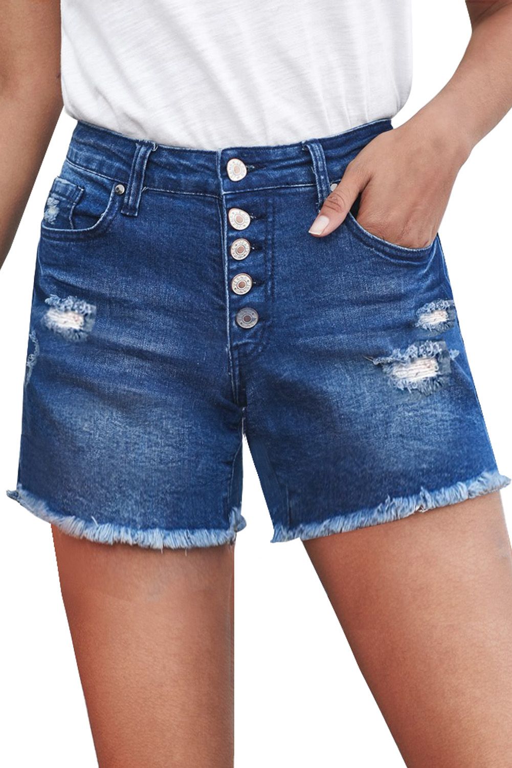 Blue Frayed Hem Single-breasted Ripped Denim Shorts